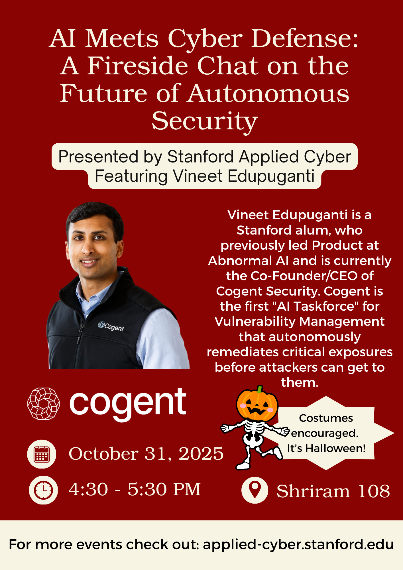 Join us this Friday for a fireside chat with Vineet Edupuganti, Co-Founder and CEO of Cogent Security, as we explore the future of AI in cyber defense. It’s Halloween–costumes are encouraged!