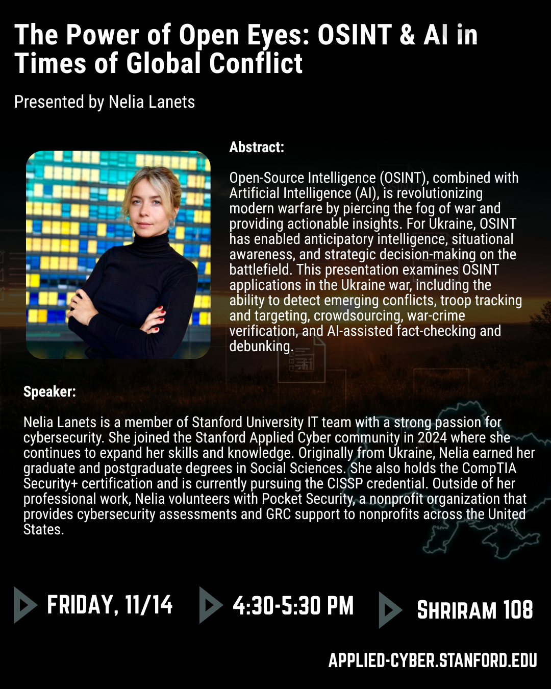 Open-Source Intelligence (OSINT), combined with Artificial Intelligence (AI), is revolutionizing modern warfare by piercing the fog of war and providing actionable insights. For Ukraine, OSINT has enabled anticipatory intelligence, situational awareness, and strategic decision-making on the battlefield. This presentation examines OSINT applications in the Ukraine war, including the ability to detect emerging conflicts, troop tracking and targeting, crowdsourcing, war-crime verification, and AI-assisted fact-checking and debunking.