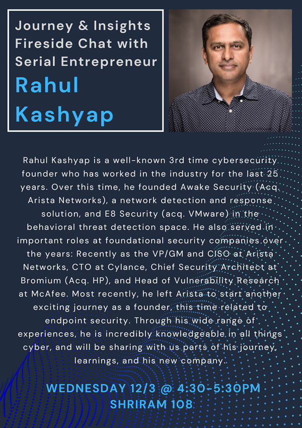 Rahul Kashyap is a well known 3rd time cybersecurity founder who has worked in the industry for the last 25 years. Over this time, he founded Awake Security (Acq. Arista Networks), a network detection and response solution, and E8 Security (acq. VMware) in the behavioral threat detection space. He also served in important roles at foundational security companies over the years: Recently as the VP/GM and CISO at Arista Networks, CTO at Cylance, Chief Security Architect at Bromium (Acq. HP), and Head of Vulnerability Research at McAfee. Most recently, he left Arista to start another exciting journey as a founder, this time related to endpoint security. Through his wide range of experiences, he is incredibly knowledgeable in all things cyber, and will be sharing with us parts of his journey, learnings, and his new company.
