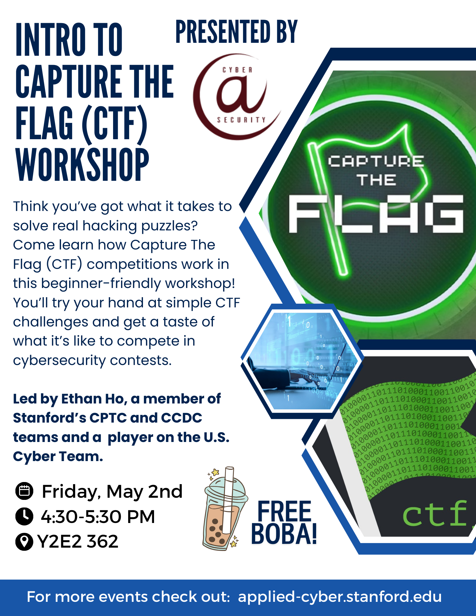 Join us for a hands-on Intro to Capture the Flag (CTF) workshop with real beginner-friendly challenges. Free boba included!