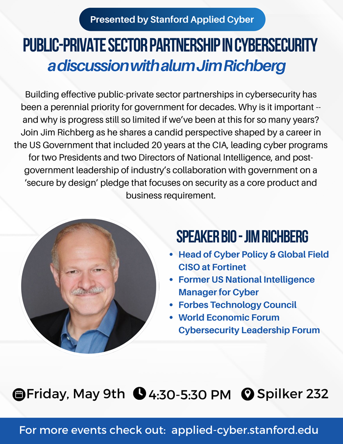 Applied Cyber welcomes Jim Richberg, a Stanford alum and current Head of Cyber Policy & Global Field CISO at Fortinet, as he draws on his extensive experience to discuss the importance of public-private partnerships in cybersecurity.