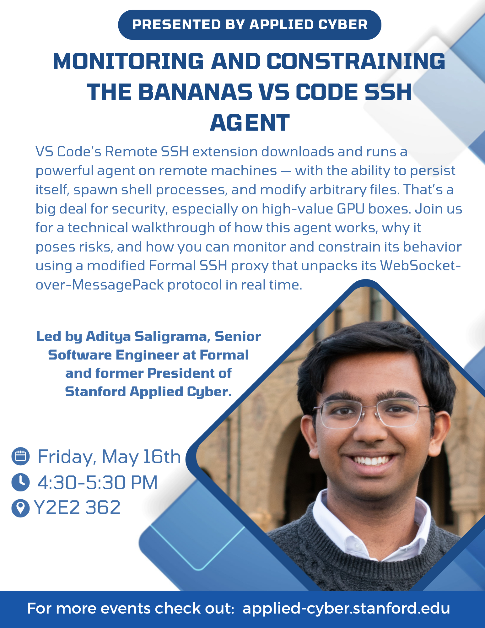Join us for a deep dive with Aditya Saligrama, Senior Software Engineer at Formal and former President of Stanford Applied Cyber, on how to reverse-engineer and constrain the powerful agent behind VS Code’s Remote SSH — and what it means for system security.