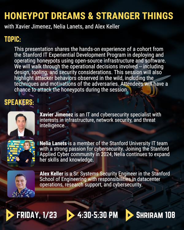 This presentation shares the hands-on experience of a cohort from the Stanford IT Experiential Development Program in deploying and operating honeypots using open-source infrastructure and software. We will walk through the operational decisions involved – including design, tooling, and security considerations. This session will also highlight attacker behaviors observed in the wild, including the techniques and motivations of the adversaries. Attendees will have a chance to attack the honeypots during the session.